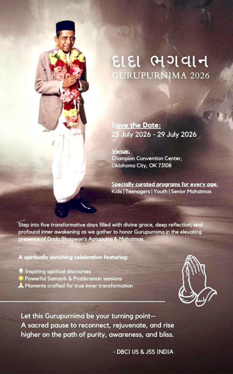 With the divine blessings of Dada Bhagwan and all Deities, we, the Mahatmas of Greater Chicago are honoured to invite you to join us in celebrating the Guru Purnima of Akram Vignani, Vatsalyamurty Dada Bhagwan, in Glenview, IL, from July 8 to July 10, 2025. This sacred event will be graced by Shilvant Aptaputras.